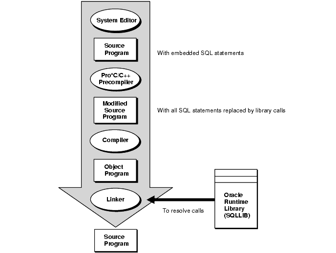 An Oracle Precompiler is a programming tool that allows you to embed SQL statements in a high-level source program. As Figure 1-1 shows, the precompiler accepts the source program as input, translates the embedded SQL statements into standard Oracle runtime library calls, and generates a modified source program that you can compile, link, and execute in the usual way.
