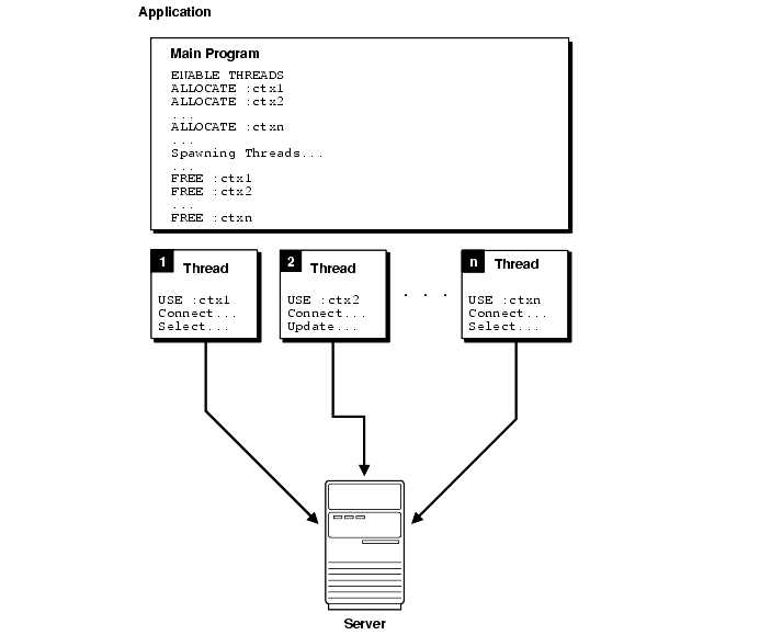 main() { sql_context ctx1,ctx2; /* declare runtime contexts */ EXEC SQL ENABLE THREADS; EXEC SQL CONTEXT ALLOCATE :ctx1; EXEC SQL CONTEXT ALLOCATE :ctx2; ... /* spawn thread, execute function1 (in the thread) passing ctx1 */ thread_create(..., function1, ctx1); /* spawn thread, execute function2 (in the thread) passing ctx2 */ thread_create(..., function2, ctx2); ... EXEC SQL CONTEXT FREE :ctx1; EXEC SQL CONTEXT FREE :ctx2; ... } void function1(sql_context ctx) { EXEC SQL CONTEXT USE :ctx; /* execute executable SQL statements on runtime context ctx1!!! */ ... } void function2(sql_context ctx) { EXEC SQL CONTEXT USE :ctx; /* execute executable SQL statements on runtime context ctx2!!! */ ... }