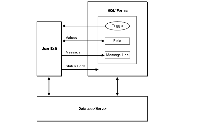 When called by an Oracle Forms V3 trigger, the user exit runs, then returns a status code to Oracle Forms. Your exit can display messages on the Oracle Forms status line, get and set field values, do high-speed computations and table lookups, and manipulate Oracle data.