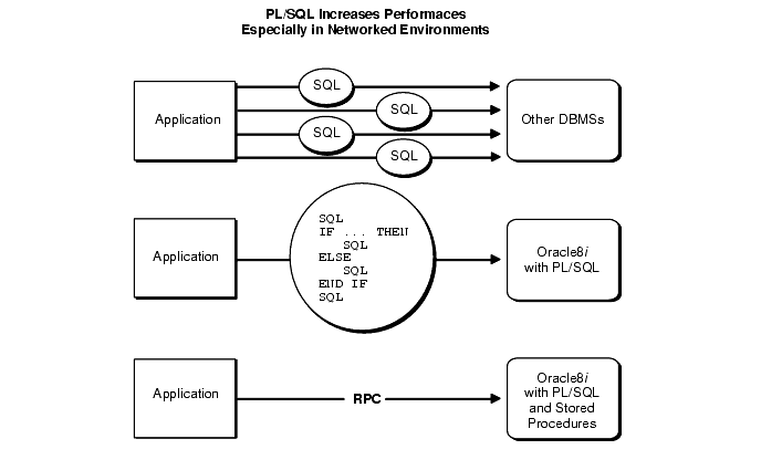 As Figure C-1 shows, if your application is database-intensive, you can use control structures to group SQL statements in a PL/SQL block, then send the entire block to the database server. This can drastically reduce communication between your application and the database server.