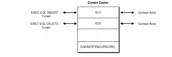 If the value of MAXOPENCURSORS is less than the number of cache entries actually needed, Oracle8i uses the first cache entry marked as reusable. For example, suppose an INSERT statement's cache entry E(1) is marked as reusable, and the number of cache entries already equals MAXOPENCURSORS. If the program executes a new statement, cache entry E(1) and its private SQL area might be reassigned to the new statement. To re-execute the INSERT statement, Oracle8i would have to reparse it and reassign another cache entry.