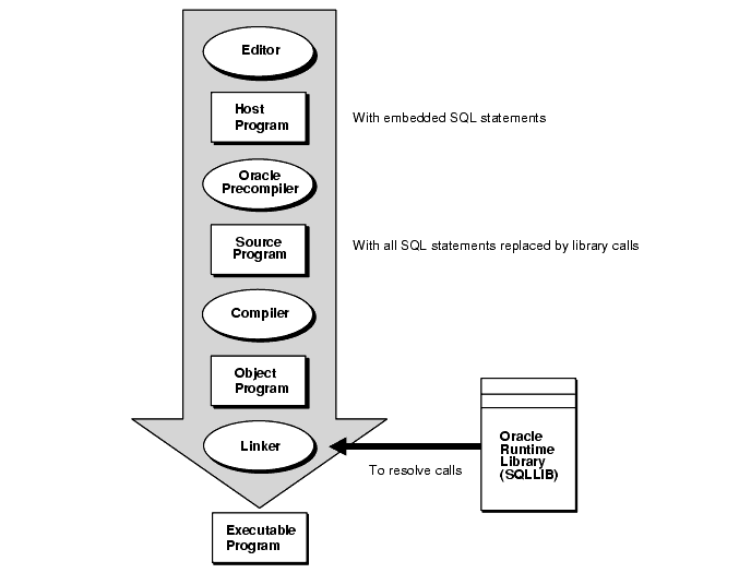 The Pro*COBOL Precompiler is a programming tool that allows you to embed SQL statements in a host COBOL program. As Figure 1-1 shows, the precompiler accepts the host program as input, translates the embedded SQL statements into standard Oracle run-time library calls, and generates a source program that you can compile, link, and execute in the usual way.