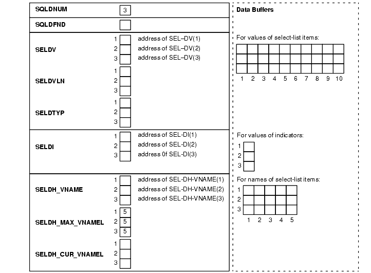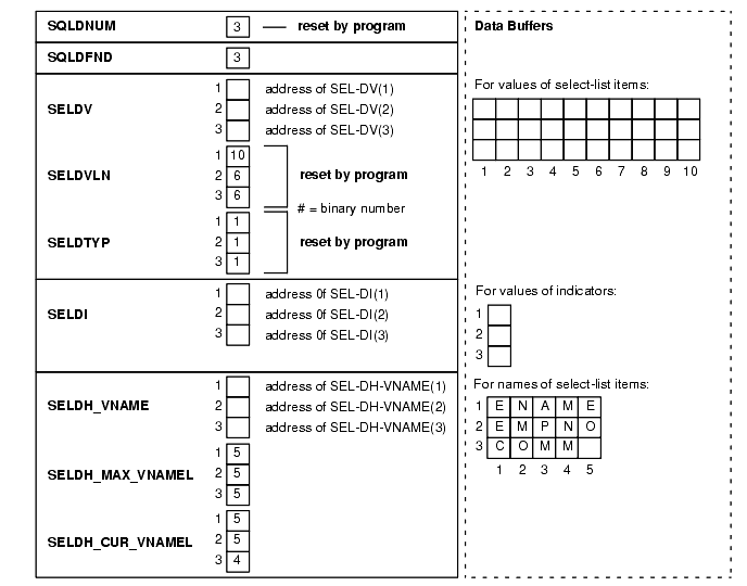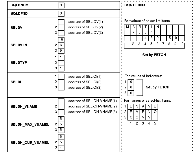 directs the database to store FETCHed select-list values in the data buffers addressed by SELDV(1) through SELDV(SQLDNUM). Thus, database stores the Jth select-list value in SEL-DV(J).