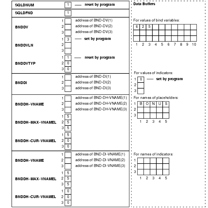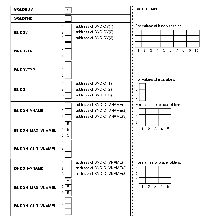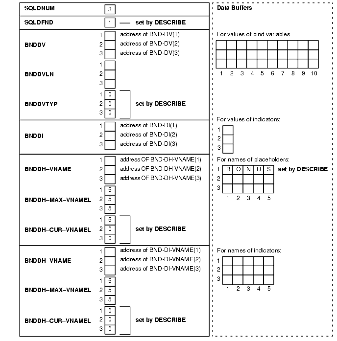 Figure 11-5 shows the bind descriptor in our example after the DESCRIBE. Notice that DESCRIBE has set SQLDFND to the actual number of place-holders found in the processed SQL statement.