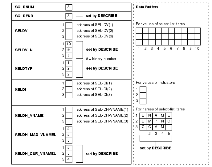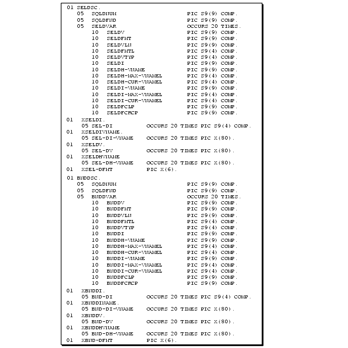 WORKING-STORAGE SECTION. ... 01 SELDSC. 05 SQLDNUM PIC S9(9) COMP. 05 SQLDFND PIC S9(9) COMP. 05 SELDVAR OCCURS 3 TIMES. 10 SELDV PIC S9(9) COMP. 10 SELDFMT PIC S9(9) COMP. 10 SELDVLN PIC S9(9) COMP. 10 SELDFMTL PIC S9(4) COMP. 10 SELDVTYP PIC S9(4) COMP. 10 SELDI PIC S9(9) COMP. 10 SELDH-VNAME PIC S9(9) COMP. 10 SELDH-MAX-VNAMEL PIC S9(4) COMP. 10 SELDH-CUR-VNAMEL PIC S9(4) COMP. 10 SELDI-VNAME PIC S9(9) COMP. 10 SELDI-MAX-VNAMEL PIC S9(4) COMP. 10 SELDI-CUR-VNAMEL PIC S9(4) COMP. 10 SELDFCLP PIC S9(9) COMP. 10 SELDFCRCP PIC S9(9) COMP. 01 XSELDI. 05 SEL-DI OCCURS 3 TIMES PIC S9(9) COMP. 01 XSELDIVNAME. 05 SEL-DI-VNAME OCCURS 3 TIMES PIC X(5). 01 XSELDV. 05 SEL-DV OCCURS 3 TIMES PIC X(10). 01 XSELDHVNAME. 05 SEL-DH-VNAME OCCURS 3 TIMES PIC X(5).