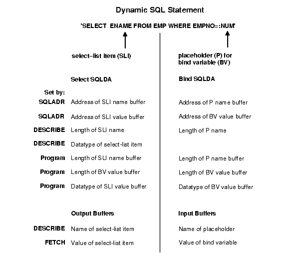 To execute a dynamic SQL statement that contains select-list items and/or place-holders for bind variables, the database needs information about the program variables that will hold output or input values. Specifically, the database needs the following information: