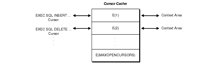 If the value of MAXOPENCURSORS is less than the number of statements that need to be cached during the execution of the program, Oracle will search for cursor cache entries to reuse once MAXOPENCURSORS cache entries have been exhausted. For example, suppose the cache entry E(1) for an INSERT statement is marked as reusable, and the number of cache entries already equals MAXOPENCURSORS. If the program executes a new statement, cache entry E(1) and its private SQL area might be reassigned to the new statement. To re-execute the INSERT statement, Oracle would have to re-parse it and reassign another cache entry.