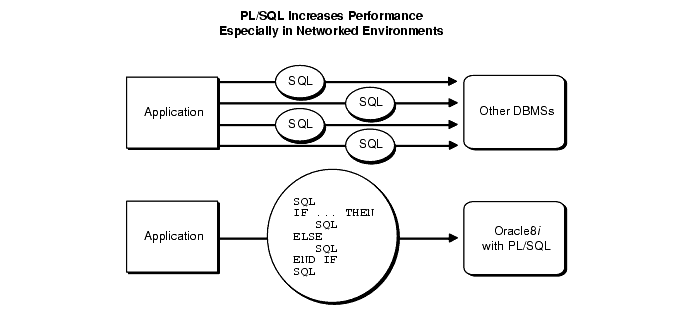 As Figure E-1 shows, if your application is database-intensive, you can use control structures to group SQL statements in a PL/SQL block, then send the entire block to Oracle. This can drastically reduce communication between your application and the database.