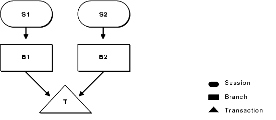 The following figure illustrates tightly coupled branches within an application. In the figure, S1 and S2, are sessions, B1 and B2 are branches, and T is a transaction. In this first example, the XIDs of the two branches would share the same gtrid, because they are operating on the same transaction, but they would have a different bqual, because they are separate branches