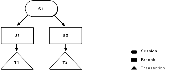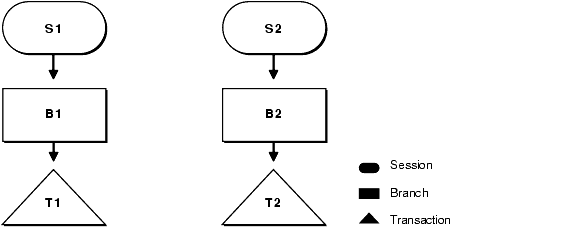 It is also possible for a single session to operate on different branches. In this case, illustrated in the next figure, gtrid component of the XIDs would be different, because they are separate global transactions