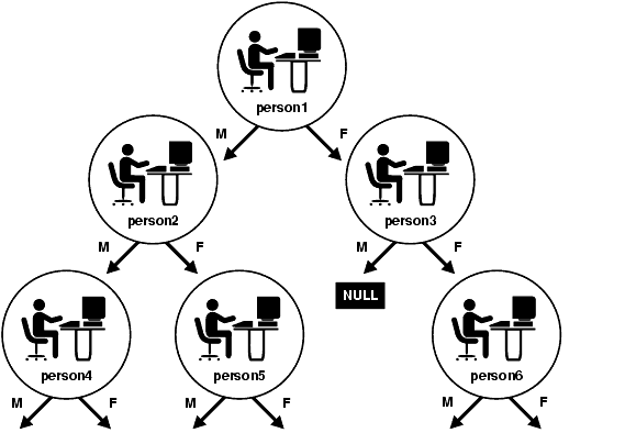 Instances of the person_t type can now be stored in the typed table. Each instance of person_t includes references to two other objects, which would also be stored in the table. A NULL reference could represent a parent about whom information is not available.
