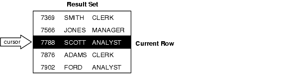 The set of rows returned by a multi-row query is called the result set. Its size is the number of rows that meet your search criteria. As Figure 1-2 shows, an explicit cursor "points" to the current row in the result set. This allows your program to process the rows one at a time.