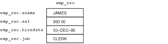 the value in the ename column of the emp table is assigned to the ename field of emp_rec, the value in the sal column is assigned to the sal field, and so on. Figure 1-3 shows how the result might appear.