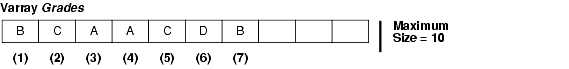 A varray has a maximum size, which you must specify in its type definition. Its index has a fixed lower bound of 1 and an extensible upper bound. For example, the current upper bound for varray Grades is 7, but you can extend it to 8, 9, or 10. Thus, a varray can contain a varying number of elements, from zero (when empty) to the maximum specified in its type definition.