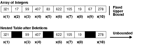 Within PL/SQL, nested tables are like one-dimensional arrays. However, nested tables differ from arrays in two important ways. First, arrays have a fixed upper bound, but nested tables are unbounded (see Figure 4-1). So, the size of a nested table can increase dynamically.