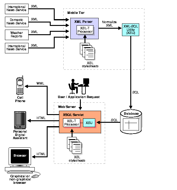 Problem. A large news distributor receives data from various news sources. This data must be stored in a database and sent to all the distributors and users on demand so that they can view specific and customized news at any time, according to their contract with the news distributor. The distributor uses XSL to normalize and store the data in a database. The stored data is used to back several websites and portals. These websites and portals receive HTTP requests from various wired and unwired clients.