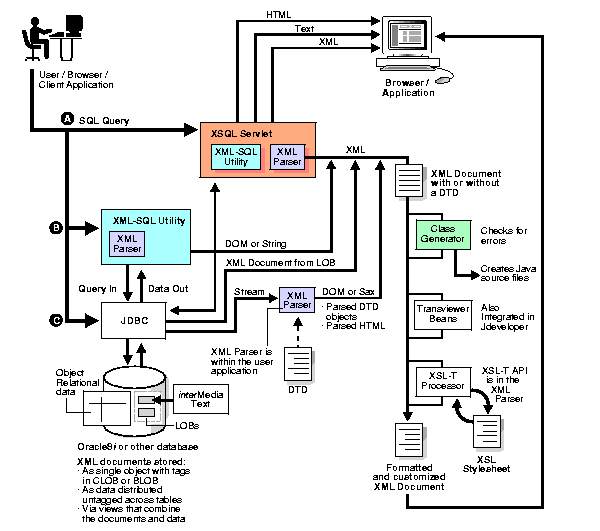 In the Java environment, when a user or client or application sends a query (SQL), there are three possible ways of processing the query using the Oracle XML components: