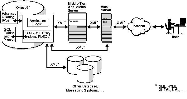 Figure 4-1 shows how a typical architecture for such a system. XML generated from XSU running inside the database can be placed in advanced queues in the database to be queued to other systems or clients. The XML can be used from within stored procedures inside the database or shipped outside via web servers or application servers.