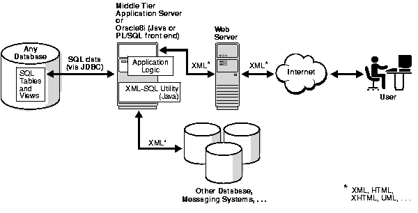Figure 4-2, shows how a typical architecture for running XSU in a middle tier. Data from JDBC sources is converted by XSU in the middle tier and then sent to web servers or other systems. Again, the whole process is bi-directional and the data can be put back into the JDBC sources (database tables or views) using XSU. If an Oracle8i database itself is used as the application server, then you can also use the PL/SQL front-end instead of Java.