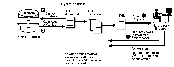 Figure 6-4 shows how dynamic generation works. Unlike the other runtime models, the administrator does not pregenerate XML documents. Instead, the Dynamic Servlet queries the database for news items based on the end-user's customization choices.