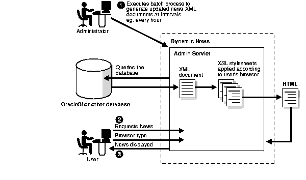 The admin executes a batch process, implemented from the Administration servlet, that queries the database and generates an XML document. When an end-user invokes Dynamic News to display all news, a servlet gets the browser type from the user-agent header of the HTTP request, then reads the XML document, and applies the appropriate XSL stylesheet.