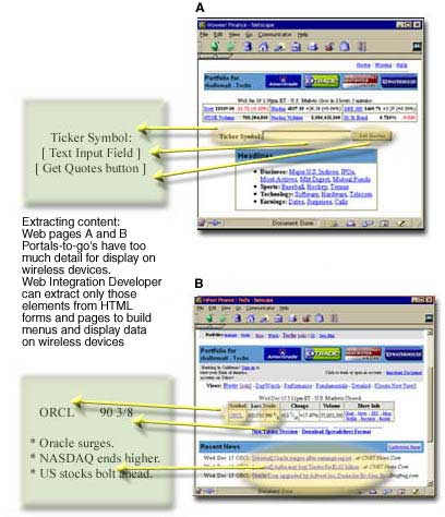 Portal-to-Go provides a GUI tool called the Web Integration Developer. It's a "screen scraper" that extracts user interface (UI) elements from a Web page. Using Web Integration Developer tools and functions, you choose UI elements and define corresponding output and input parameters.
