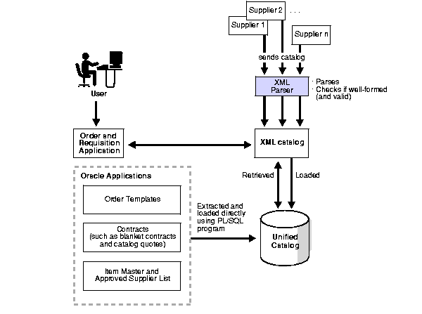 iProcurement uses XML to load catalogs received from various suppliers or catalog service providers, into "unified catalog tables" in the iProcurement database. See Figure 10-1.