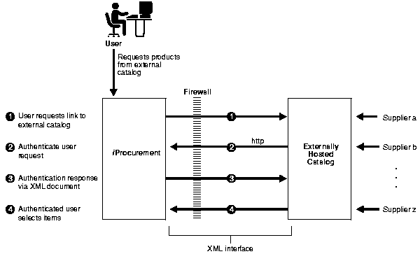 Figure 10-2 illustrates the data exchange process when users select items from supplier-hosted on-line catalogs. While shopping in iProcurement, the following exchange protocol occurs: