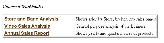 <?xml version="1.0" encoding="UTF-8"?> <?xml-stylesheet type="text/xsl" href="example1.xsl"?> <discoverer version="3.5.8.12" login_method="discoverer"> <account name="myname@mydatabase" ref="MYNAME%40mydatabase"> <user>MYNAME</user> <database>mydatabase</database> <eul default="true" name="myeul"> <workbook name="Store and Band Analysis" ref="Store~20and~20Band~20Analysis"> <description>Shows sales by Store, broken into sales bands</description> </workbook> <workbook name="Video Sales Analysis" ref="Video~20Sales~20Analysis"> <description>General purpose analysis of the business</description> </workbook> <workbook name="Annual Sales Report" ref="Annual~20Sales~20Report"> <description>Shows yearly and quarterly sales of products</description> </workbook> </eul> </account> </discoverer>