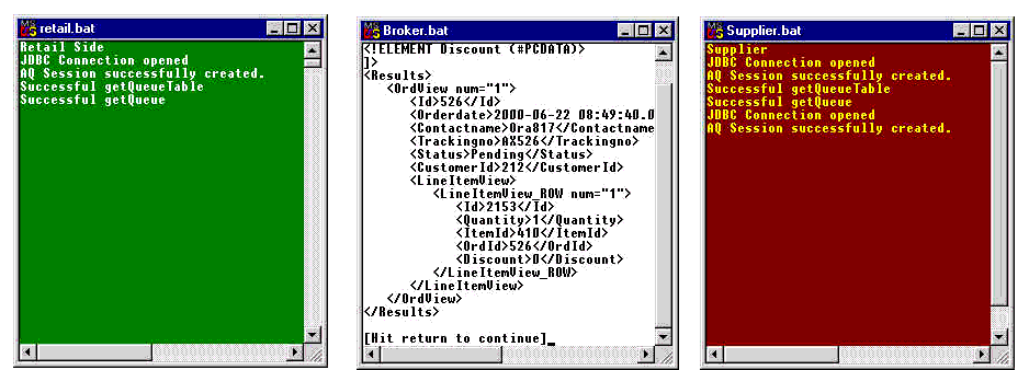 Figure 13-17 [AQ Broker]: Viewing the retailer.bat, broker.bat, and supplier.bat Consoles (1 of 3)