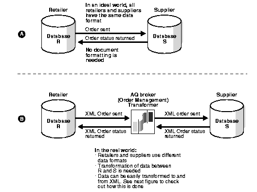 Figure 13-1 Why Transform Data to XML?: Retailer's Order Data Can be recognized by Any Supplier - Supplier's Order Status and Acknowledgement Can be Recognized by any Retailer