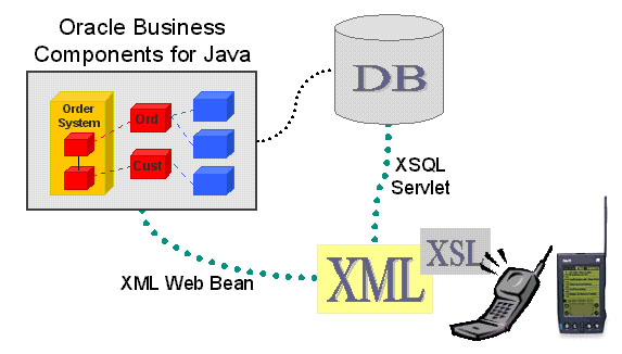 Figure 14-8 shows schematically how the mobile application works with BC4J, XSQL Servlet, XSL Stylesheets, and Oracle8i.