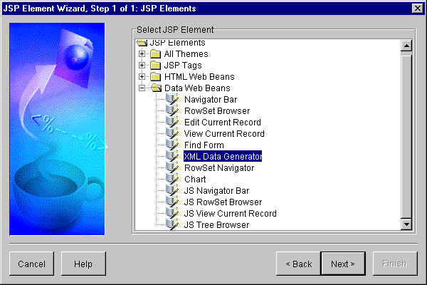 The Data Generator Web Bean is in the "Data Web Beans" category of the JSP Elements wizard. Figure 14-5 illustrates accessing the XML Data Generator Web (Bean) from the JSP Element Wizard.