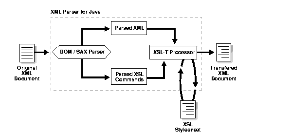 If a stylesheet is used, the DOM or SAX interface also parses and outputs the XSL commands. These are sent together with the parsed XML to the XSL-T Processor where the selected stylesheet is applied and the transformed (new) XML document is then output.