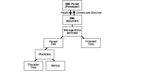XML documents are made up of storage units called entities, which contain either parsed or unparsed data. Parsed data is made up of characters, some of which form character data, and some of which form markup.