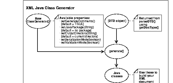 XML Java Class Generator works in conjunction with XML Parser for Java, which parses the DTD and passes the parsed document to the Class Generator.