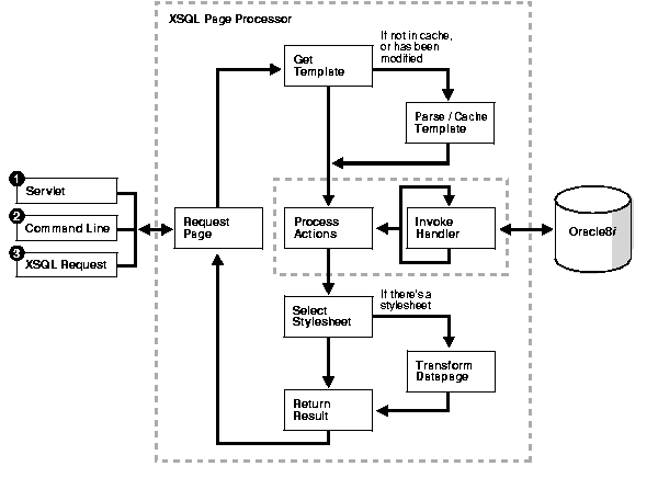 Figure 19-8 describes in detail what goes on inside the XSQL Page Processor when processing a request. See Figure 19-6 for the broad picture.