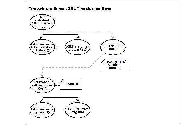 Figure 20-2 illustrates the XSL Transformer Bean usage. For examples of implementing this bean, see "Transviewer Bean Example 1: AsyncTransformSample.java".