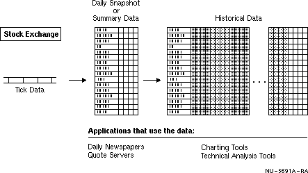 In Figure 2-1, each trade on the stock exchange includes several items of information, including a ticker and a price (for example, stock XYZ at 37.50). The daily summary data includes the opening, high, low, and closing prices for each ticker (for example, for XYZ: 37.75, 38.25, 37.00, 37.625). The daily data for each ticker is appended to the historical data for the ticker. The daily data is used for such purposes as quote server applications and listing in the next day's newspapers; the historical data is used by such applications as price and volume charting and technical analysis.