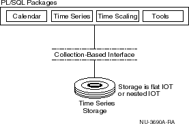 Figure 2-3 shows the Oracle8i Time Series architecture. At the lowest level, a storage option is required, and this must be a flat index-organized table (IOT), a flat table, or a nested IOT. The actual product consists of PL/SQL packages for calendar, time series, and time scaling functions and for administrative tools procedures. In addition, a collection-based interface between time series storage and the packaged functions is provided.