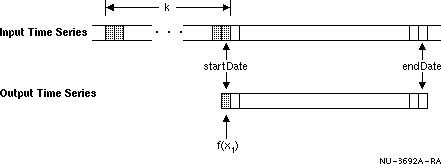 The relationship between the input and output time series in the computation of a moving average or sum is illustrated in Figure 2-5. The figure focuses on the common invocation of moving average or sum, where k is the number of timestamps in the lookback window (for example, 30) and a date range (startDate and endDate) is supplied. (For more information about the parameters, see the Mavg function description in Chapter 5.)