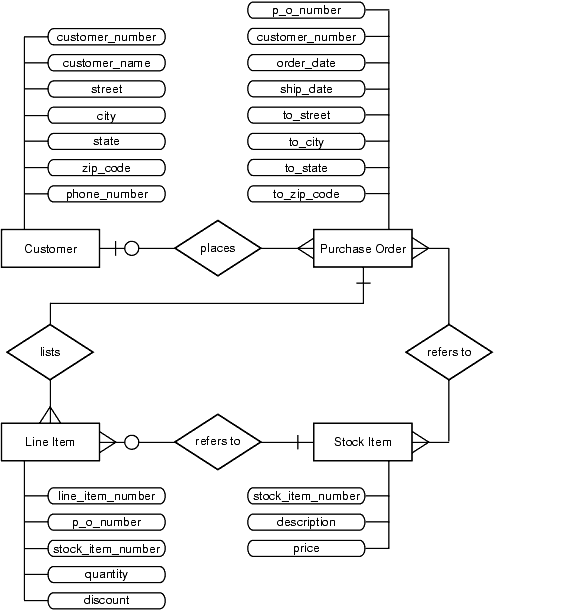 As Figure 5-2 illustrates, the basic entities in this example are customers, purchase orders, line items, and stock items.
