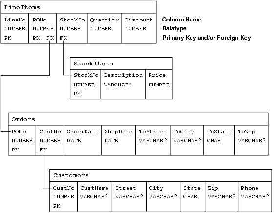 Figure 5-3 depicts the relationships between tables. The E-R diagram showed that a line item has a relationship with a purchase order and with a stock item. In the schema plan, you establish these relationships using primary and foreign keys.