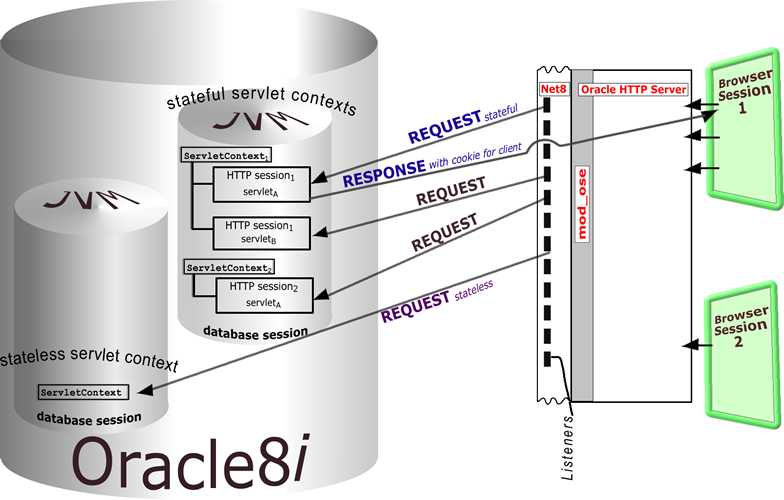 Database Session Creation, Termination, and Time-OutsThe first time an HTTP client connects to an instance of Oracle8i running OSE, a session is created inside the database. The session is a regular database session that runs its own virtual JVM.