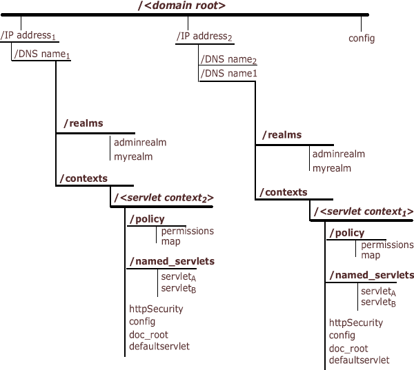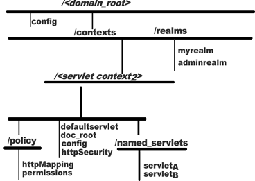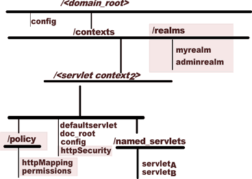 Figure 1-4 shows the relationship of the realms and policy directories with respect to the rest of the domain in the JNDI namespace. realms is at the top level of the domain, whereas policy is a sub-directory of servlet context.