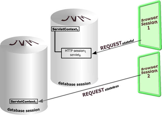 One of the differences between OSE and other servlet engines is how the database session used is designed. Browser-sessions set up servlets sessions. The database session contains all the HTTP session objects created for that particular browser session. By employing database session memory, objects are not dropped after the request (connection) ends. However, objects are dropped when the database session ends.