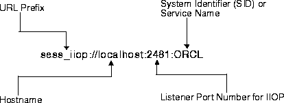 Oracle8i provides universal resource locator (URL) syntax to access services and sessions. The URL lets you use JNDI requests to start up services and sessions, and also to access components published in the database instance. An example service URL is shown in Figure 4-1.