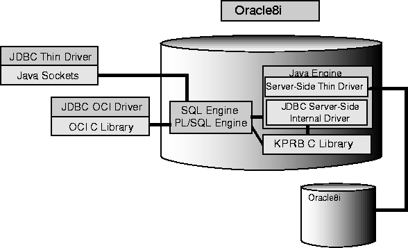 Figure 1-1 illustrates the driver-database architecture for the JDBC Thin, OCI, and server-side internal drivers.