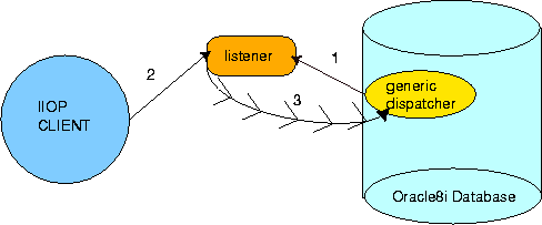 When the database does start up, all dispatchers register with all listeners configured within the same database initialization file. However, when an IIOP client invokes a request, the listener will only redirect the request to a GIOP dispatcher or hand off to a generic dispatcher.