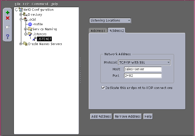 This places the following in the listener.ora file: it modifies the listener to specify TCPS --instead of TCP--as the protocol with port number 2482. The following shows an example of an SSL-enabled listener on the sales-server host.